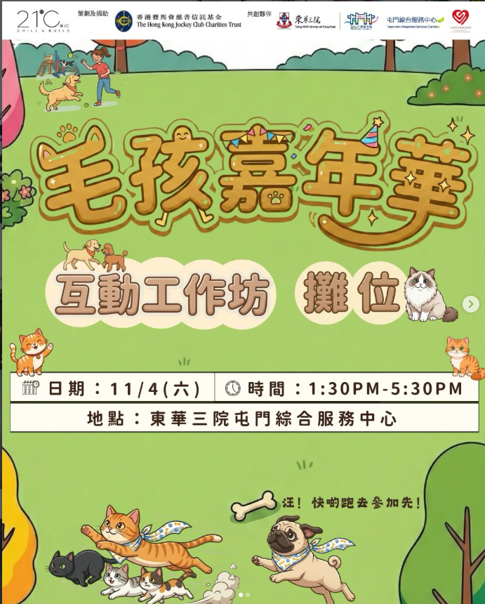 各位注意!約定你 4 月11號(六) 嚟屯門玩轉超 Chill 嘅毛孩嘉年華! 齊集專業毛孩訓練指導、親手 DIY 零食&玩具,仲有打卡必備嘅 Face Painting 同扭汽球,一齊解鎖超多好玩互動新技能!