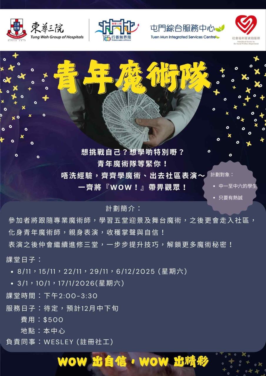 參加者將跟隨專業魔術師,學習五堂迎景及舞台魔術,之後更會走入社區,化身青年魔術師,親身表演,收穫掌聲與自信!表演之後仲會繼續進修三堂,一步步提升技巧,解鎖更多魔術秘密!